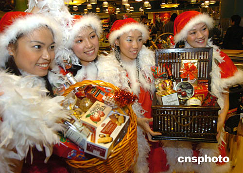 香港一家外國公司11月4日在香港太古廣場由圣誕俏女郎率先推出圣誕禮物籃﹐以吸引消費者。作者:趙振清