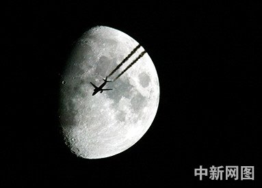 在德國紐倫堡的夜空中,一架客機飛過月亮時拍攝的圖片。