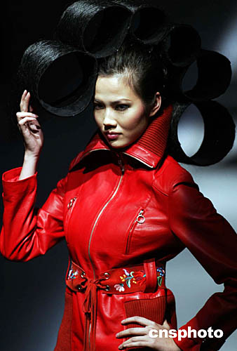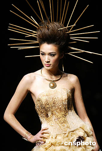 十一月二十三日,在中國國際時裝周會場北京飯店內,一場時裝發布會通過一組構思奇特的模特造型將服裝設計師的時裝設計作品演繹得淋漓盡致,也更添模特嬌媚。中新社記者:盛佳鵬