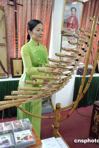 身著民族服裝的越南女藝人,在胡志明市的旅游景點演奏越南民族樂器。作者:邢健