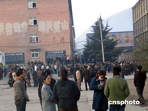 十一月二十八日早七時許,陜西省銅川市耀州區的陳家山煤礦發生特大瓦斯爆炸。正在井下作業的二百九十三名礦工中,已有一百二十七人安全出井,尚有一百六十六人被困井下。圖為礦工親屬在礦井坑口出口處焦急等待親人的消息。作者:景榮