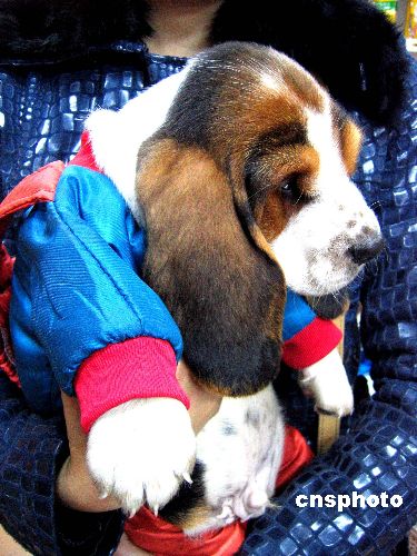 11月29日,在南京夫子廟寵物市場,一條名為巴吉度的德國犬種寵物狗身穿面料考究、做工精良、款式新穎的小棉襖和背帶褲由主人抱著逛市場,一幅悠閑自得的模樣。孫忠南 攝