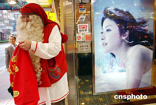 圖為圣誕老人在銅鑼灣鬧市向市民贈送禮物。