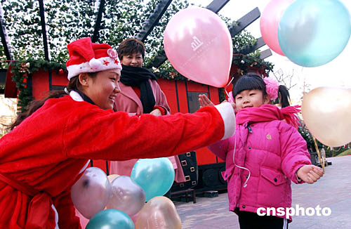 十二月五日,北京一家商場把公司員工打扮成圣誕老人的模樣為過往顧客派發圣誕禮品和氣球,以此招徠顧客。作者:韓藝冰