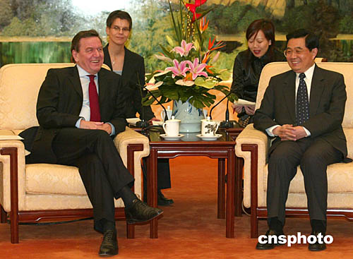 施羅德說(shuō),目前德中關(guān)系發(fā)展順利,不存在任何突出問(wèn)題。兩國(guó)不僅在政治、經(jīng)貿(mào)領(lǐng)域,而且在文化、科技、青年交流等方面都保持著良好合作,在重大國(guó)際問(wèn)題上看法相同或相似。德方對(duì)兩國(guó)關(guān)系的發(fā)展感到滿意。德國(guó)政府將繼續(xù)奉行一個(gè)中國(guó)政策,不做不符合一個(gè)中國(guó)政策的事。德國(guó)有改造老工業(yè)區(qū)的經(jīng)驗(yàn),愿意積極參與中國(guó)振興東北等老工業(yè)基地的發(fā)展戰(zhàn)略。