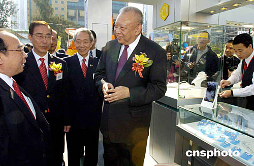 香港特區行政長官董建華,12月11日在維園主持“第三十九屆工展會”開幕典禮,隨后興致勃勃的參觀會場。圖為董建華在中華廠商聯合會長楊孫西等陪同下了解珠寶業在內地發展業務的情況。