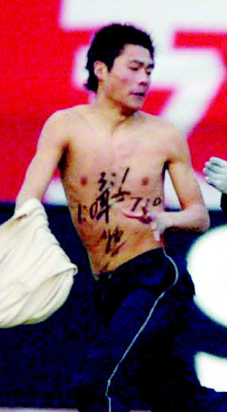 昨天下午,在首屆中超杯決賽中,擁有主場之利的魯能泰山隊?wèi){借舒暢和王超的進(jìn)球,2:0擊敗聯(lián)賽冠軍深圳健力寶隊,如愿將中超杯冠軍獎杯留在了濟(jì)南。在王超打入第二球后,賽場上出現(xiàn)了戲劇性一幕,一名赤膊的年輕球迷突然沖進(jìn)賽場,上演了國內(nèi)綠茵場的首次“裸奔”鬧劇。