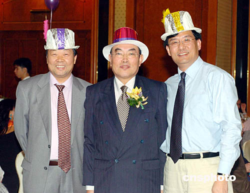 中聯辦副主任王鳳超[中]、中新社香港分社社長章新新、香港文匯報社長張國良[左]在晚宴上。作者:宋吉河