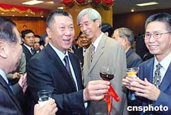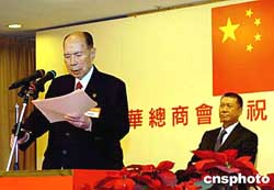 全國政協副主席、澳門中華總商會會長馬萬祺,16日在澳門中華總商會慶祝澳門特別行政區成立五周年酒會上致辭,澳門特別行政區行政長官何厚鏵參加酒會。作者:宋吉河