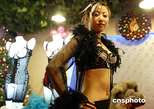 十二月二十五日圣誕節(jié),在北京寶兒金領(lǐng)生活館,一場(chǎng)別開(kāi)生面的臺(tái)灣薇尼喬二零零五年新款內(nèi)衣秀為許多白領(lǐng)女性增添了生活樂(lè)趣。中新社記者:任海霞