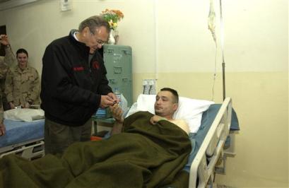 中新網12月26日電 美國國防部長拉姆斯菲爾德在圣誕前夕突然造訪伊拉克的美軍部隊,并且慰問軍中的傷員。