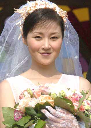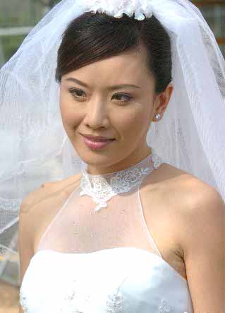 香港亞洲電視正在拍攝的電視劇《爸爸兩邊走》劇組27日來到香港西貢三育中學教堂前﹐在劇中扮演新娘的張文慈身著婚紗更迷人。趙振清 2004-12-27 21:13:25