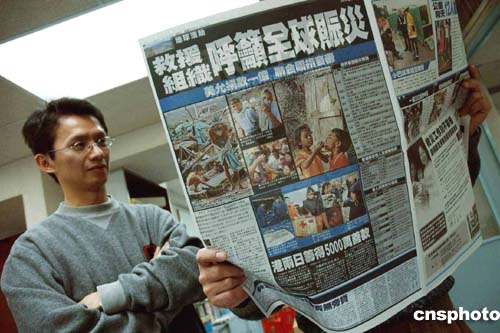 香港報刊報導;南亞海嘯世紀大災難首次傳來港人死訊,1名39歲香港男子證實在泰國布吉死亡,在這次災難中,另有213港人失去聯絡。12月 29日上午,市民閱讀當天新聞密切關注有關消息。作者:洪少葵