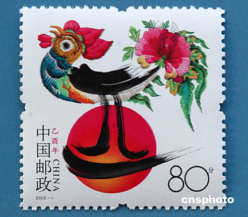 中國國家郵政局定于2005年1月5日發行《乙酉年》特種郵票1套1枚,郵票面值為人民幣80分。這套郵票是中國發行的第三輪生肖郵票中的第二套。在十二生肖排序中,雞象征著振奮和吉祥。北京市郵票公司為配合國家郵政局發行郵票,特設計印制了該郵票的首日封等郵品,與郵票同日發行。中新社記者:鄒憲