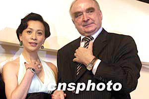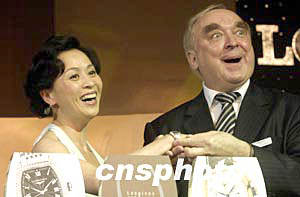 五月十三日晚,劉嘉玲現身北京,為瑞士斯沃琪公司旗下的著名手表品牌經典“浪琴表典藏”系列助興。圖為劉嘉玲(左)與浪琴表全球總裁霍凱諾(右)展示新款手表。作者:高遠