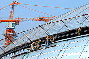 五月二十四日,建筑安裝工人正在國家大劇院殼體穹頂施工。國家大劇院橢圓形殼體穹頂自四月一日開始安裝鈦金屬板以來,工程進展順利,預計六月底完成。中國國家大劇院由法國設計師保羅·安德魯設計。中新社記者:張煒