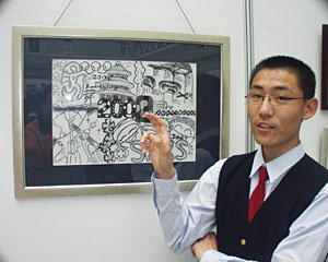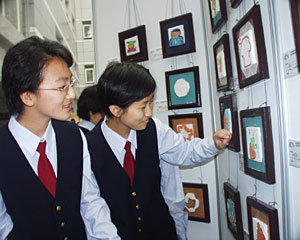 記者在展覽上看到,在寬敞的大廳內,擺滿了學生創作的作品,包括版畫、民間剪紙、刮畫、紙雕、面具、漫畫、海報、中國結等十多種,內容涉及更廣,如環保、奧運會、行為規范、國慶等。十四歲的葛雅靜,看上去十分靦腆。這次展覽她如魚得水,有五幅作品入選,是所有參展學生最多的。她的刮畫極富想象力豐富,吸引觀者駐足。據她說,父母都不是從事藝術工作的,她是上藝術課上后,逐漸發現自己愛上畫畫了。