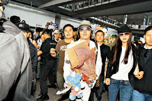 張赫戴上帽,身穿白衫白褲;全智賢則穿黑褸和牛仔褲,在昨午1時(shí)30分抵港,電影公司聘請(qǐng)了廿多位保安在機(jī)場(chǎng)護(hù)送兩人,但當(dāng)他們出閘時(shí),熱情Fans一擁而上,更突破了防線,令場(chǎng)面變得混亂。混亂中,張赫的Fans欲送鮮花給偶像,但卻錯(cuò)手擊中全智賢的頭部,“中頭獎(jiǎng)”的全智賢用手摸頭頂呼痛,之后一度黑口黑臉。