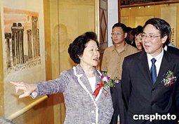 藝術(shù)大師方召麟博士書畫作品展暨捐贈儀式五月三十日在江蘇無錫舉行。方召麟長女、香港特區(qū)政務(wù)司原司長陳方安生(左)及方氏家族親屬,代表方召麟向江蘇無錫市政府捐贈六十件書畫精品。作者:顧祚維