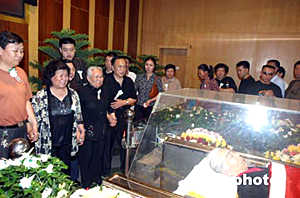 在鄭州市殯儀館內,記者看到,躺在鮮花叢中的常老是那樣的安詳。鮮花簇擁的靈柩上,覆蓋著一面鮮紅的中共黨旗。靈柩上方,黑紗環繞著常香玉的照片——花白頭發,寬邊眼鏡,大紅毛衣外罩,端莊慈祥寧靜的笑容,一派優雅。雖然其親屬根據常老的遺愿盡量使儀式簡樸,然而前往吊唁的各界人士一度達到幾千人,整個儀式大廳被圍了個水泄不通。