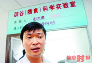 據彭先生介紹,1996年他曾在工廠里自行絕食過53天。開頭的幾天內,感到很難受,到了第四天以后,饑餓感消失,而且感覺很舒服,思維、行動變得敏捷靈活了。“只要掌握足夠的醫學理論,絕食60天絕對沒有問題。”彭先生顯得非常自信地說。