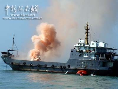 此時,觀摩演習(xí)的人們發(fā)現(xiàn),在出事船只周圍,已經(jīng)有多條各類救助船開始行動,中國救助船“南鷹”輪和“南海救一六八”輪一左一右向燃燒著的遇難船只進行壓制性滅火。兩只泡沫槍和一只高壓水槍對準海難船強制滅火。此時的場面蔚為壯觀,一只高壓水槍激起的水霧在熱帶陽光的照耀下出現(xiàn)了一道漂亮的彩虹。