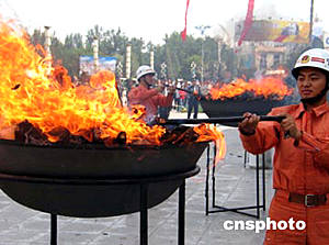 寧夏回族自治區公安廳今天在首府銀川的中山廣場舉行焚燒毒品大會,現場對該自治區禁毒部門二年多來收繳的四十七點二公斤毒品、五十七點五公斤大麻籽和部分精神藥品進行了集中銷毀。