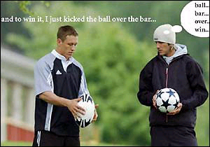 圖2展示了貝克漢姆逐字逐句向橄欖球明星約翰·威爾金斯請教如何罰球的場面,后者告訴貝克漢姆,通常,在罰球前,他會把球放在一個土堆上,如圖3。