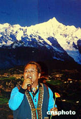 七月四日晚,參加情系香格里拉——兩岸文化聯(lián)誼行活動(dòng)的兩岸四地文化界人士在香格里拉與迪慶州文藝界人士歡聚一堂,交流文化,增進(jìn)友誼。圖為來(lái)自臺(tái)灣原住民文化推廣協(xié)會(huì)理事長(zhǎng)麥村連先生登臺(tái)演唱。中新社記者:武仲林