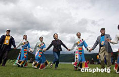 七月四日,參加情系香格里拉——兩岸文化聯(lián)誼行活動(dòng)的兩岸四地文化界人士來(lái)到美麗的云南香格里拉屬都湖,體驗(yàn)藏族鍋莊舞的自然、豪放。中新社記者:武仲林