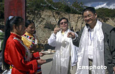 七月五日,參加情系香格里拉——兩岸文化聯(lián)誼行活動(dòng)的兩岸四地文化界人士來(lái)到德欽,受到當(dāng)?shù)夭刈逋臒崃覛g迎。圖為澳門(mén)基金會(huì)委員吳志良先生(右一)、澳門(mén)中華文化藝術(shù)協(xié)會(huì)理事長(zhǎng)霍志釗先生(右二)品嘗藏族姑娘敬獻(xiàn)的青稞酒。中新社記者:武仲林