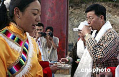 七月五日,參加情系香格里拉——兩岸文化聯(lián)誼行活動(dòng)的兩岸四地文化界人士來(lái)到德欽,受到當(dāng)?shù)夭刈逋臒崃覛g迎。圖為臺(tái)灣金門(mén)縣縣長(zhǎng)李炷烽先生品嘗藏族姑娘敬獻(xiàn)的青稞酒。中新社記者:武仲林