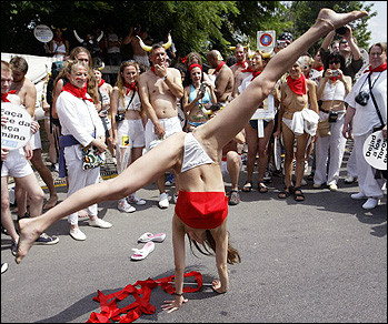 圖文:抗議奔牛節(jié)的女子表演倒立