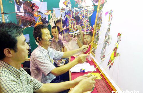 中國傳統“皮影戲”在兒童廟會上的亮相,引來了不少兒童好奇的目光。中新社記者:湯彥俊
