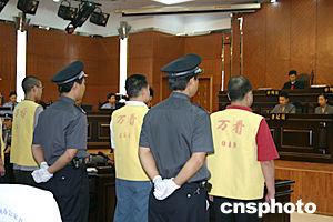 “一二·二三”特大井噴事故案今天上午九時三十分在重慶市第二中級人民法院開庭審理。圖為審判庭內(nèi)被告人在接受問訊。作者:鄒輝
