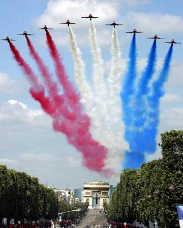法國空軍飛機從凱旋門上空飛過,留下與國旗顏色相同的彩色煙霧