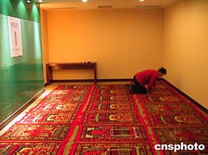 七月十五日,二零零四年中國亞洲杯足球賽重慶賽區舉行了指定下榻酒店揭牌儀式,為尊重不同國家的宗教和風俗習慣,指定酒店還準備了禱告房。圖為工作人員正在布置重慶賽區球隊下榻酒店內的禱告房。二零零四年中國亞洲杯足球賽將于七月十七日正式開幕。作者:郭晉嘉