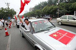 遼寧盤錦球迷驅車趕到北京,觀看七月十七日晚在北京工人體育場舉行的二零零四年亞洲杯足球賽揭幕戰。中新社記者:毛建軍