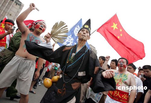 一名球迷十七日裝扮成“濟公”形象,在亞洲杯足球賽開幕式會場外吶喊,為亞洲杯首度在中國舉辦而喝彩。二零零四年亞洲杯足球賽十七日晚在北京開幕。作者:毛建軍