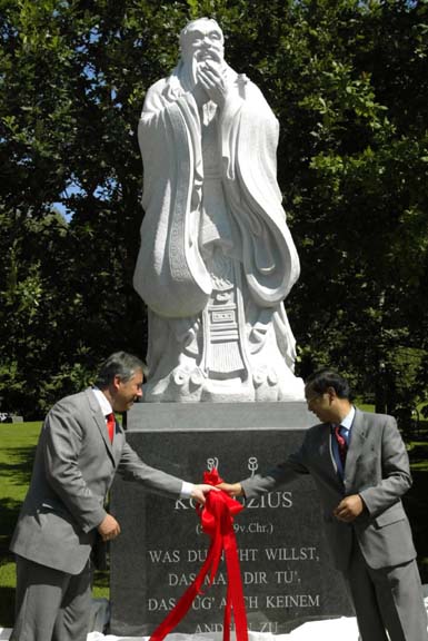 中新網7月31日電 7月30日,柏林市長克勞斯﹒沃韋賴特(左)和中國駐德國臨時代辦施明德(右)在柏林中國花園舉辦的“孔子雕像揭幕儀式”上為孔子雕像揭幕。