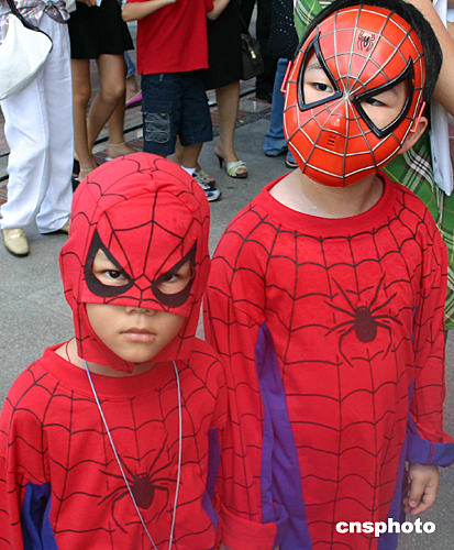 為慶祝臺北偶戲館開張,八月七日臺北街頭舉行了戲偶隊伍游行。圖為兩名打扮成電影“蜘蛛俠”造型的小朋友。作者:董會峰