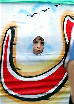 中新網8月11日電 據法新社報道,在加沙地帶,巴勒斯坦“伊斯蘭圣戰”組織的武裝分子正在舉行反抗以色列的集會活動。圖為一名巴勒斯坦男孩正從一面旗幟的破洞處探出腦袋,伸首觀望。(固山)