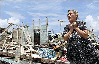中新網8月16日電 據法新社報道,日前,“查理”颶風襲擊了古巴。在兩個小時的時間里,颶風所到之處,房頂被掀起,大樹被拔根而起。颶風造成當地電力供應中斷。據報道,有3人在此次災害中喪生,4人受傷。圖為古巴巴拉科地區的一位居民正站在她家門前,向人敘述著她是如何死里逃生的。她身后的房屋早已被颶風痍為一片平地。(春風)