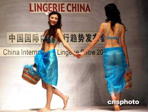 八月十九日,黛安芬、歐迪芬等世界多家知名內衣品牌在北京舉行2005春夏中國內衣流行趨勢發布會,模特通過六個主題從色彩和風格方面詮釋未來內衣形象。中新社記者:王麗南