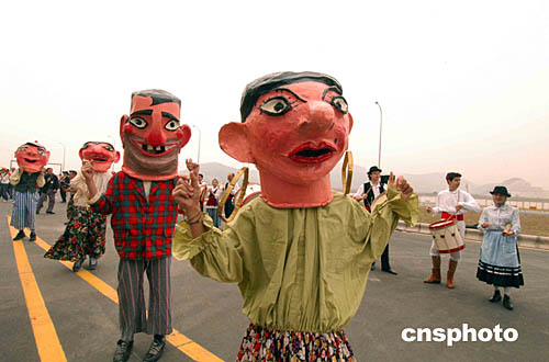 四千多名志愿者和近五萬(wàn)名澳門市民跨越將于九日正式開(kāi)通的西灣大橋。行政長(zhǎng)官何厚鏵敲響一聲銅鑼,西灣大橋一帶形成一條人的長(zhǎng)龍,場(chǎng)面蔚為壯觀。沿途東亞運(yùn)志愿工作者組成的旗隊(duì)演示了多種旗陣,踩高轎,舞醉龍,銀樂(lè),葡國(guó)土風(fēng)舞和小丑魔術(shù)表演等,高潮迭起。