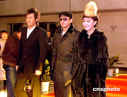 第七屆中國長春電影節(jié)一月十二日晚在長春落幕。在當(dāng)晚的頒獎晚會上,眾多明星出席。圖為著名影星范冰冰(右)、周杰(中)和王學(xué)兵一同走過星光大道。作者:吳兆飛