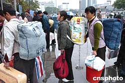一月十三日,在廣州火車(chē)站已陸續(xù)看到外來(lái)民工離粵返鄉(xiāng)過(guò)年。盡管春運(yùn)未至,許多及時(shí)領(lǐng)到工錢(qián)的民工趁鐵路客運(yùn)高峰還未到來(lái),早早啟程回家。作者:陳文