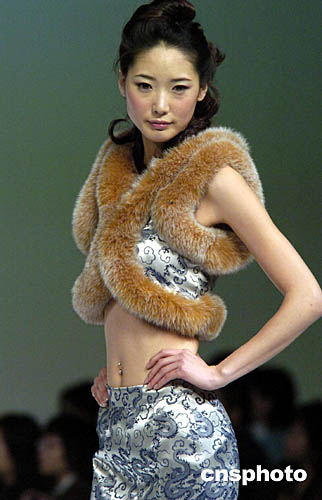 1月19日,香港會展中心舉行的“香港時裝節秋冬系列2005”上,模特展示一款皮草披肩。作者:洪少葵