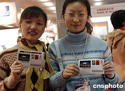 | 兩名北京女青年一月二十日上午來到北京國貿(mào)中心展館,在“第三屆北京國際體育基礎(chǔ)設(shè)施和場(chǎng)館技術(shù)展覽會(huì)”金牛直通自助售票機(jī)前,各自模擬定購了附有自己快照的2008年(8月8日20:00時(shí))北京奧運(yùn)會(huì)開幕式----國家體育館漂亮的觀眾票,模擬票價(jià)在千元以上不等。此次展會(huì)匯聚了國內(nèi)外眾多著名電子服務(wù)和場(chǎng)館技術(shù)企業(yè)。中新社記者:鄒憲