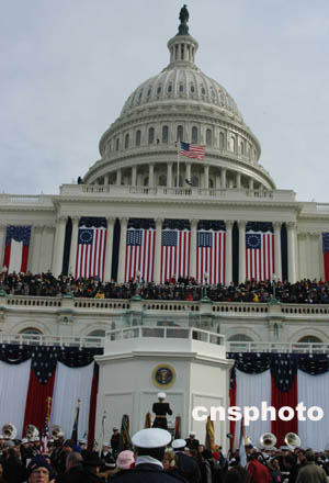 在美國軍樂隊的《鼓號齊鳴》和《向統(tǒng)帥致敬》吹奏樂后,中午十二點整,布什在防彈玻璃圍成的講臺上發(fā)表就職演說。出人意料的是,布什并沒有談到治國方略,更沒有提及外交政策,甚至連天天在美國媒體上連篇累牘的伊拉克問題也沒有說起。